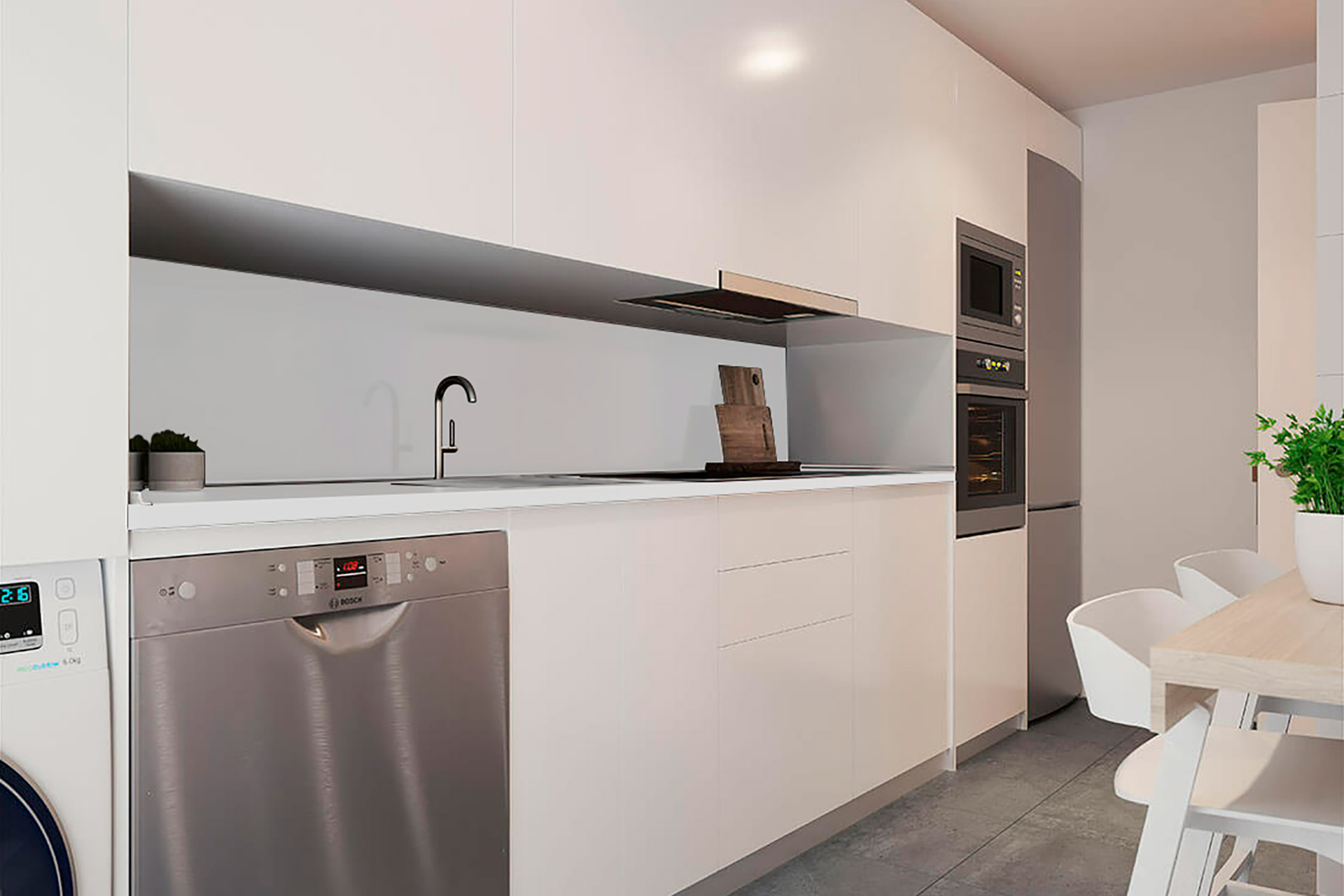 Práctico diseño de cocina con armarios altos y bajos de gran capacidad, encimera y frente de cuarzo.